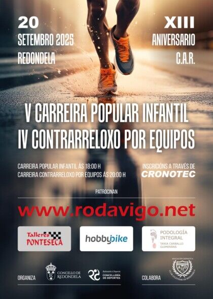 O SÁBADO 20 DE SETEMBRO DE 2025 terán lugar en Redondela a V edición da CARREIRA POPULAR INFANTIL, organizadas polo CONCELLO REDONDELA, e co patrocinio de RODAVIGO e a colaboración do C.A.R. ASOCIACIÓN DEPORTIVA.